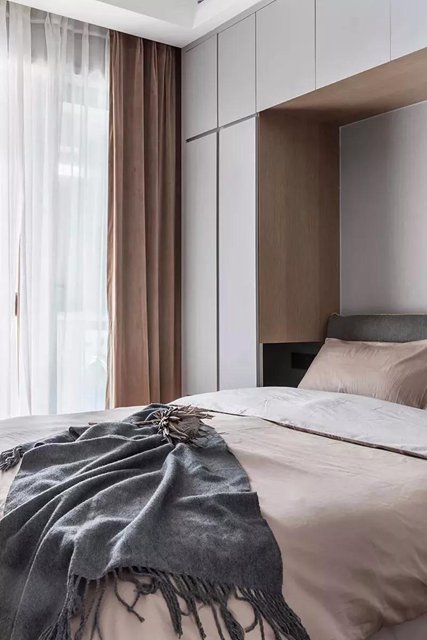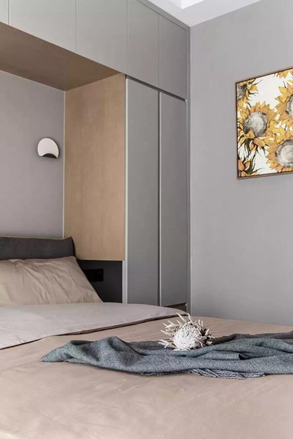 次臥整個床頭區(qū)域被柜體包圍,這樣緊湊的設(shè)計,把邊角利用到極致。