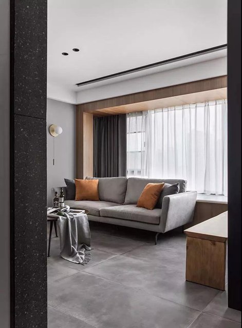 沙發(fā)靠飄窗擺放,兩個棕色抱枕與灰調(diào)搭配,質(zhì)感滿滿。