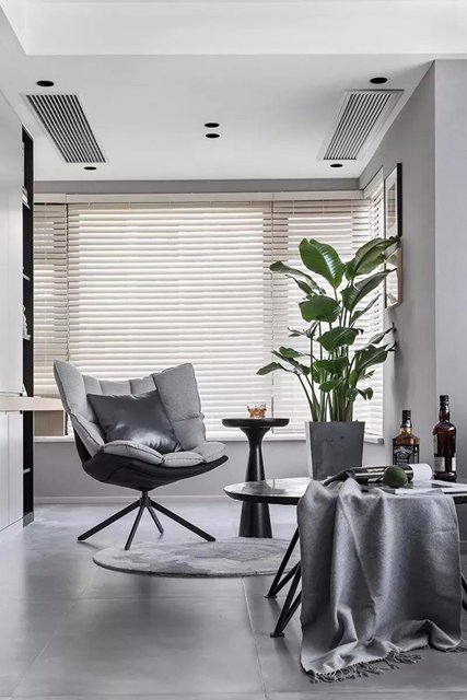 客廳將灰調(diào)運用的淋漓盡致,茶幾與沙發(fā)椅皆由灰黑色交織,簡約大氣。
