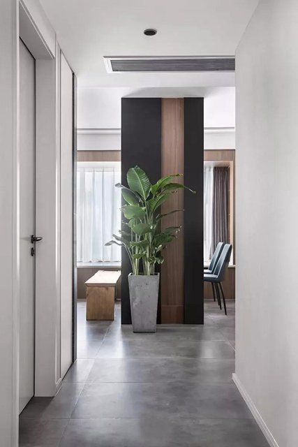 玄關(guān),推開大門,面對的是依靠餐廳的一個小造型墻。黑色與木質(zhì)的飾面,擺上一盆天堂鳥,在水泥地面與花盆的襯托下,整體簡約又自然。