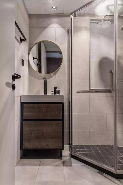 衛(wèi)生間,鉆石型的淋浴房以黑色小磚打底。浴室柜剛剛好安置在淋浴房旁的角落,掛一個圓形的裝飾鏡,細膩而精致。