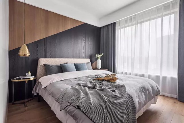 主臥,木質(zhì)的床頭背景墻,以一道斜紋劃分出木與黑的界限,帶來一個簡約時尚的空間。