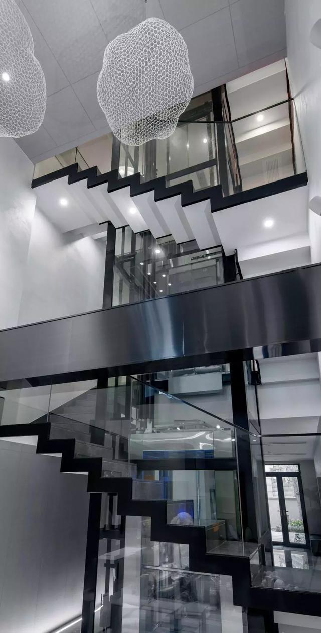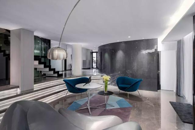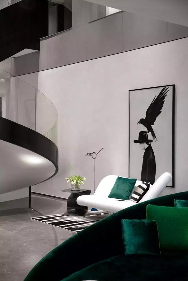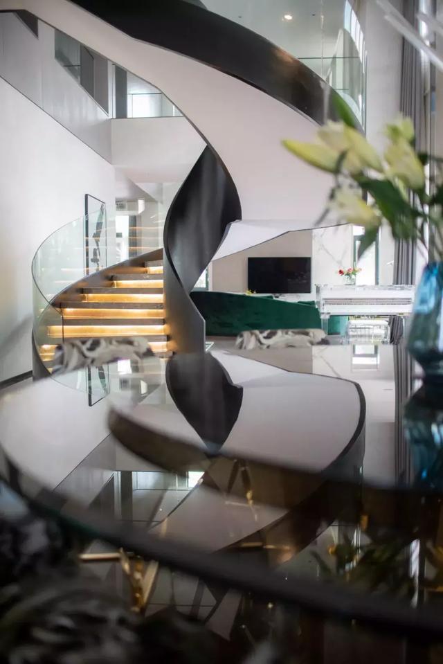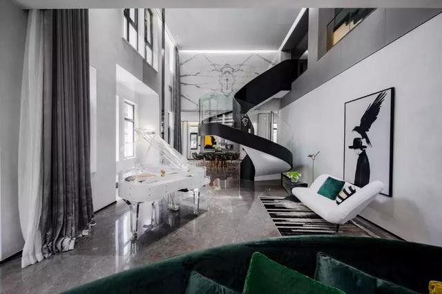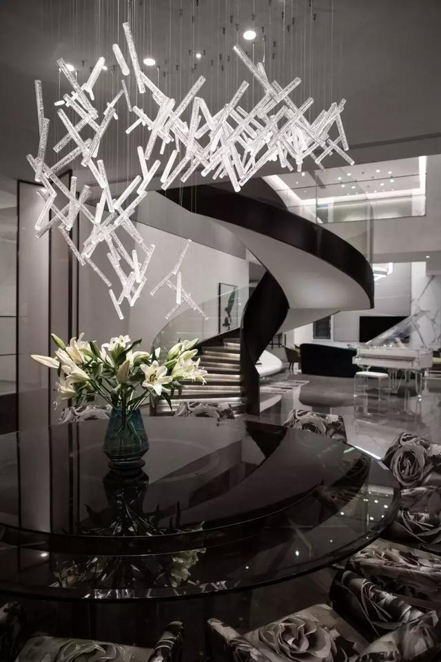 家具選用意大利知名品牌,非常講究品質,同時凸顯個性獨特與眾不同,并以流線形為主來表現女性的優雅。那一架透明的鋼琴造型乖巧優美,透明的質地和應著白色大理石的花紋質感以及圓形樓梯的力量感,妥當地存在于空間一隅。精心選擇的掛畫恰如其分地豐滿著空間有些高冷的表情。