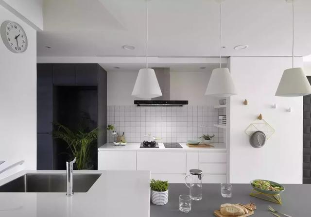 餐廚空間以六角磚分野場域,中島與灰質餐桌的鋪排,平行于料理區,順暢使用動線,而面壁的一字形廚房,不使用時,能將白色門片拉上,讓空間完美隱形。