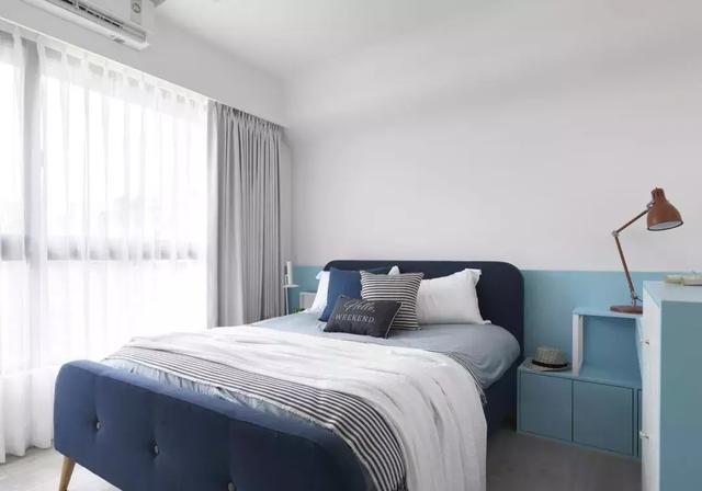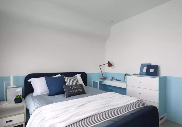 走進私領域空間以深、淺藍色定調減壓氛圍,并讓墻面油漆與柜體融合,整齊立面視覺。