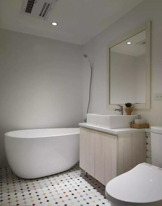 衛浴入口選用化妝板當作門片,將空間中出現過的色彩漸層鋪排渲染,成為宛如大幅畫作的特色亮點,仿佛讓空間隱形于公領域。而兩間衛浴皆運用木質流理臺、鏡面,帶來紓壓氛圍,并延攬幾何線條、色彩的應用,分別在立面、地坪以馬卡龍色系的磁磚鋪排,呈現各自特色,變化出不同面貌的北歐風格。