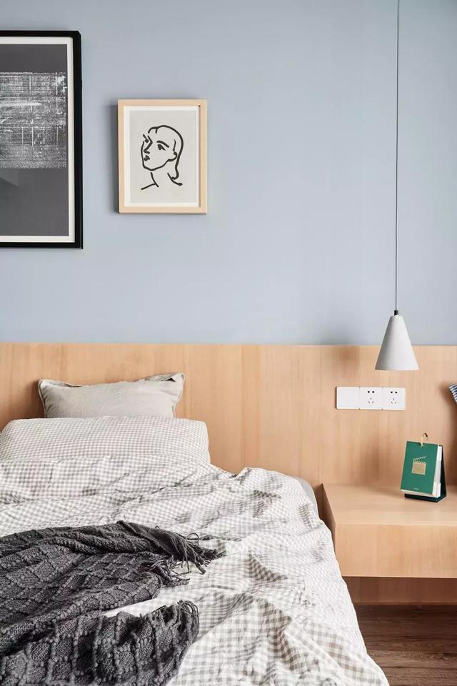 主臥的床頭柜、床靠背和飄窗是一體化設計,配合MUJI無靠背收納床,整體風格清新簡約。淺灰色的背景墻和水泥燈稍稍添了些清冷氣息。