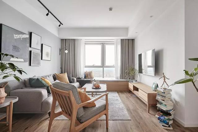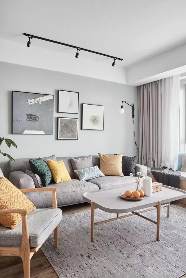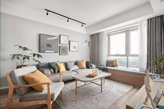 夾邊套的客廳朝向偏北,采光不是特別好,因此客廳的設計重點是明亮。軌道燈代替主燈,搭配大飄窗和色調輕淺的家具,輕盈不失溫馨。