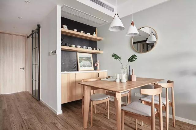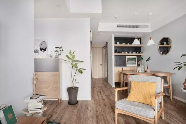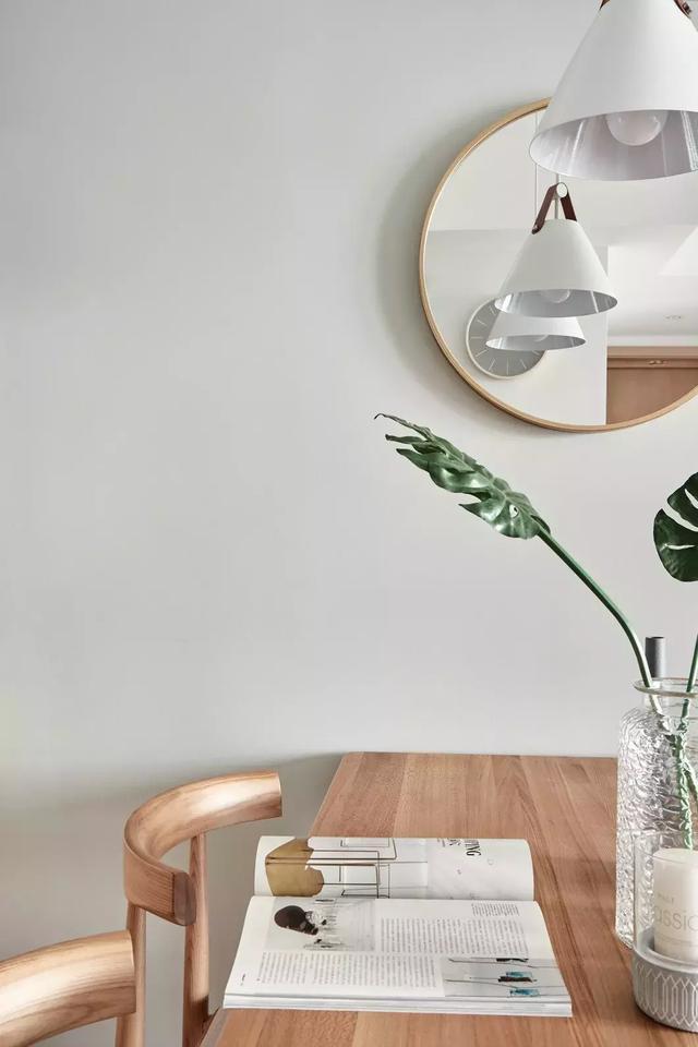電視裝了壁掛的架子,滿足邊吃飯邊看電視的小愿望。年輪風格的地板色調年輕,摸上去會有木紋的肌理感,北歐中不乏工業風質感。
