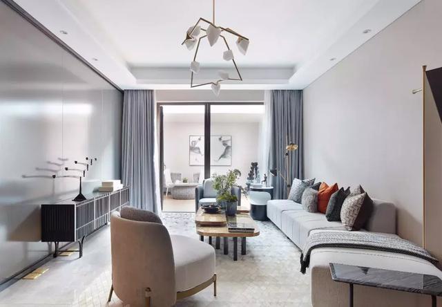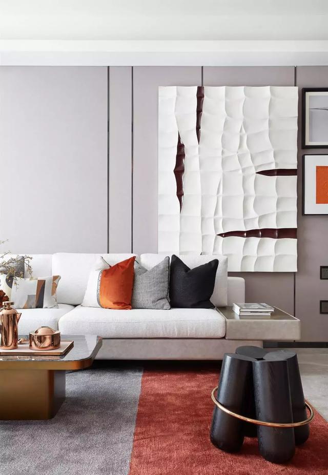 轉(zhuǎn)過玄關(guān),大橫廳的優(yōu)勢(shì)盡顯無遺。在高級(jí)灰為主調(diào)的色彩系統(tǒng)中,明亮如冬日陽光的愛馬仕橙色及金色配飾,則瞬間讓整個(gè)氛圍活躍起來。客廳電視背景墻與玄關(guān)造型相輔相成,搭配線條感極佳的意式組合沙發(fā),使整個(gè)空間優(yōu)雅又不失時(shí)尚感。
