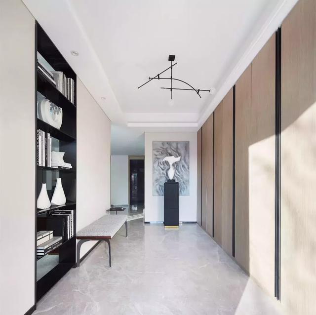 沒有什么能比深度達(dá)4.7米的玄關(guān)更能邀請(qǐng)陽光的到訪。玄關(guān)內(nèi),長榻、連排收納柜、獨(dú)特的雕塑與抽象畫,無不散發(fā)著令人向往的簡約氣息。在玄關(guān)與客廳之間的鏤空置物層架設(shè)計(jì),巧妙地讓兩個(gè)空間能夠產(chǎn)生更多的互動(dòng)。這既強(qiáng)調(diào)玄關(guān)的獨(dú)立性和縱深感之余,又增加了虛實(shí)相生的趣味性。