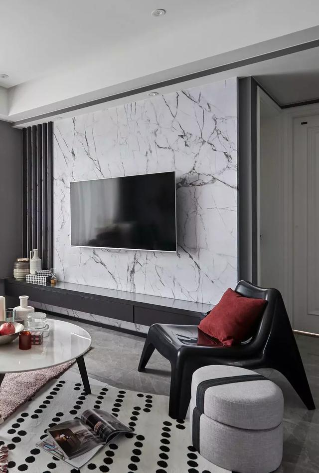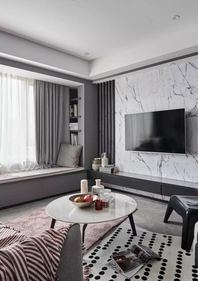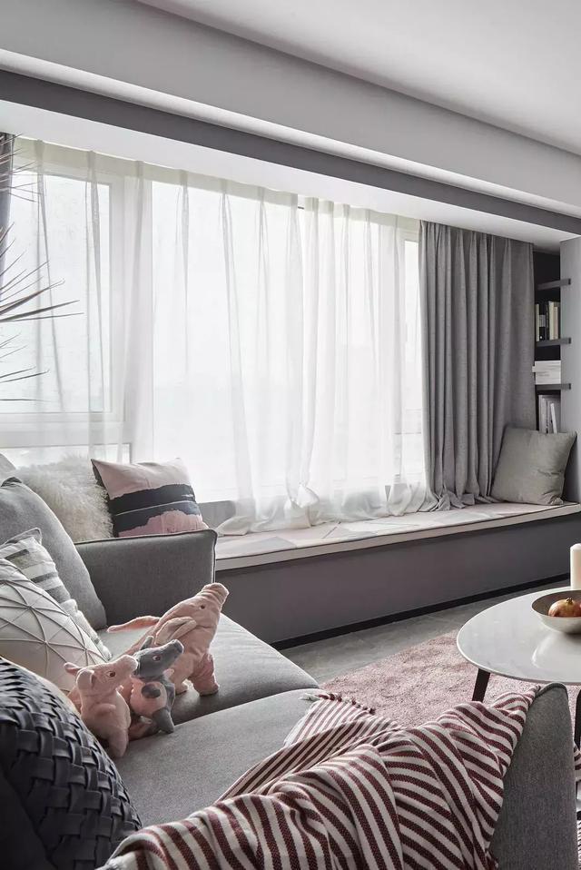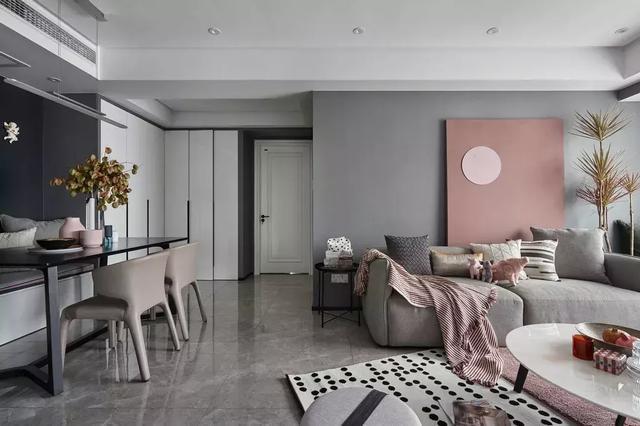 黑波點地毯和煙粉色地毯交疊,使本來平淡的灰色調客廳瞬間個性十足,顏值爆升。