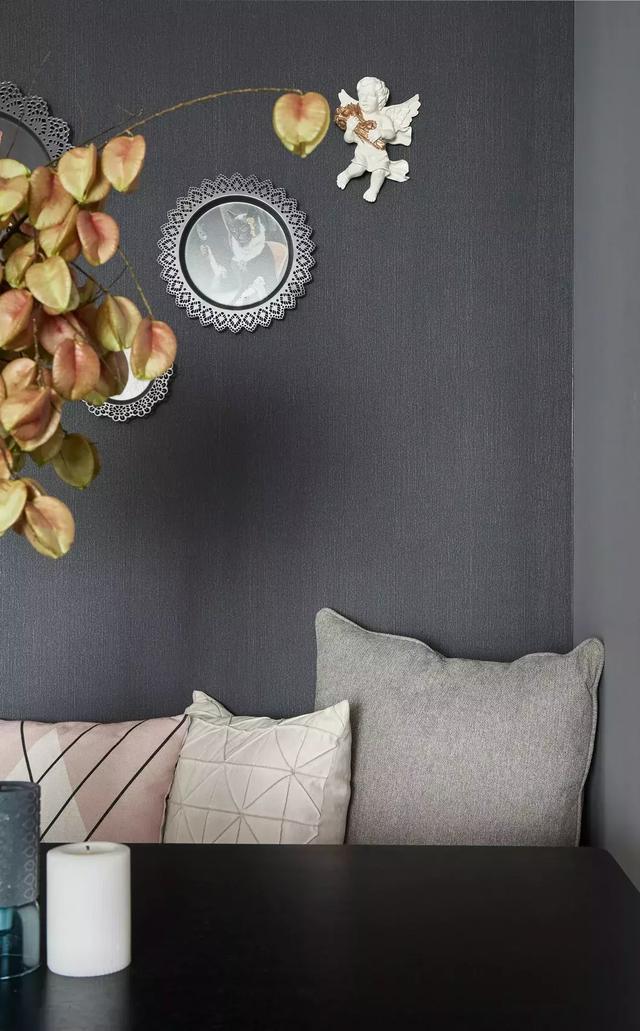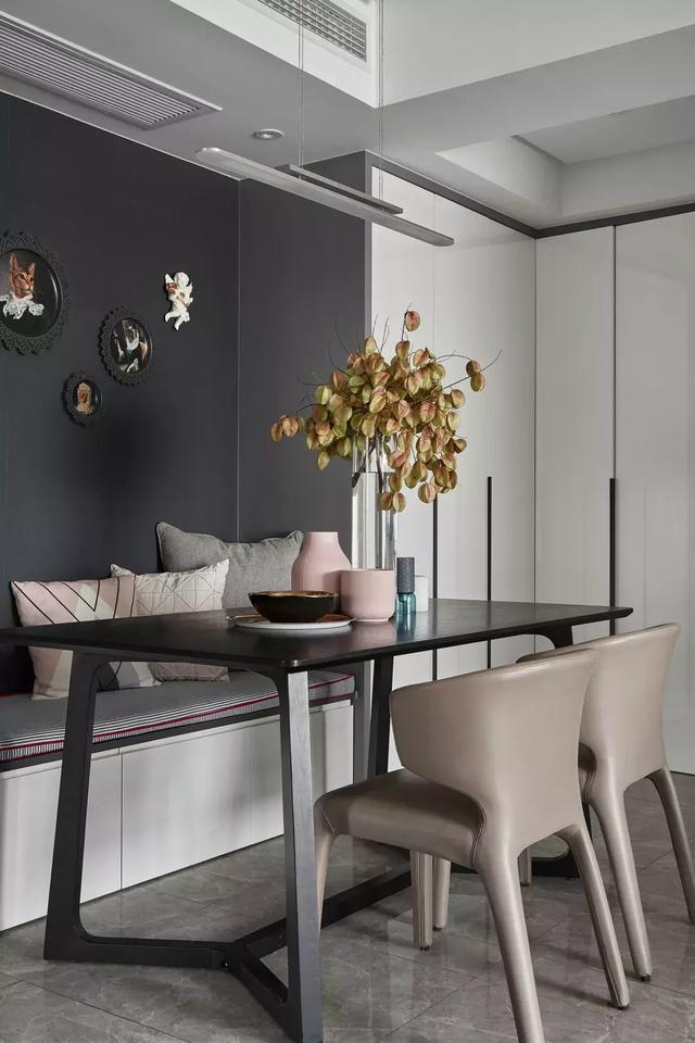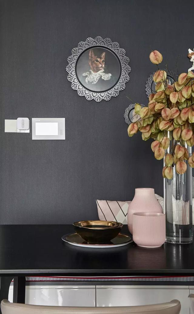 墻面同色系的復古掛盤打破了深灰色的沉靜,飛翔的“天使”歌頌著生活的美滿與幸福,這些文字訴不盡的細節都反映著設計師對生活美學的“小心思”。