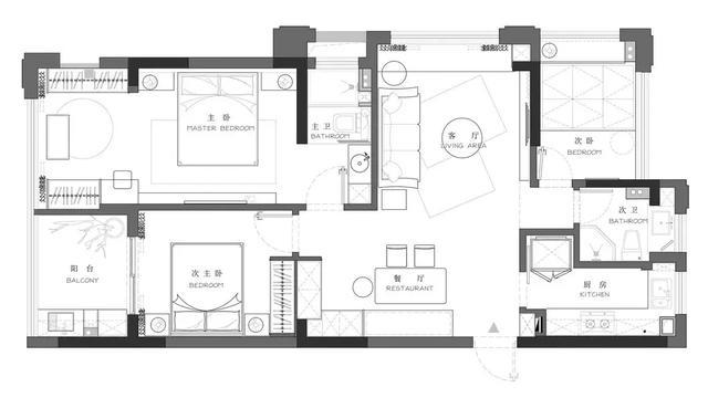 主臥納入了原陽臺作為衣帽間,一整面的落地玻璃窗帶來了極好的視野和采光,讓主臥的空間配比寬敞而明亮。