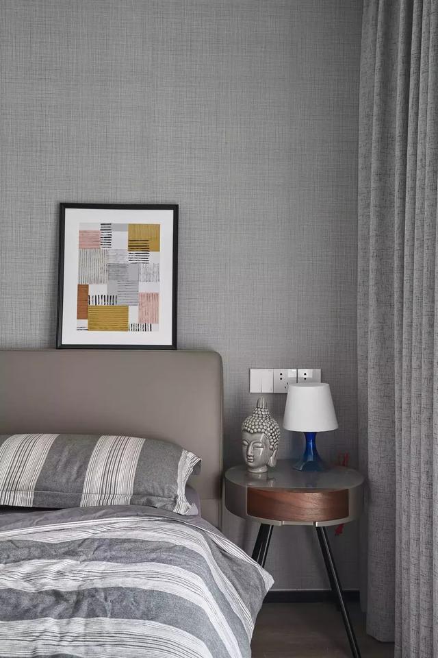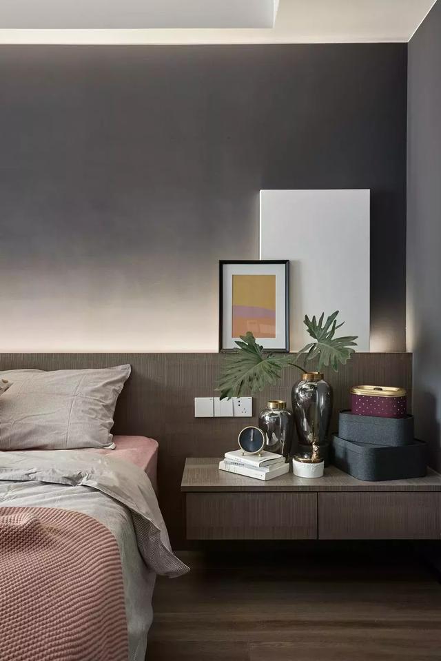 木工現場制作的床頭背板與床頭柜,貼的是臺灣原廠木飾面板,質感獨特而精致,線性的洗墻燈帶能更好的營造溫馨而安寧的舒睡氛圍。