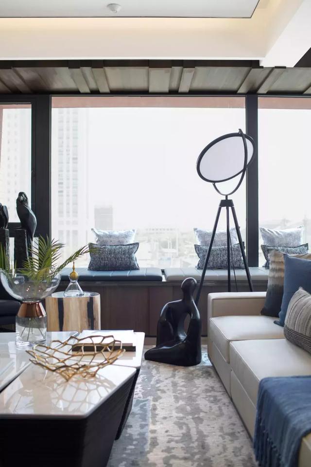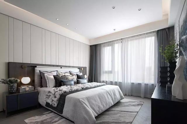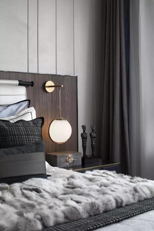 層疊的黑白灰色的床品,搭配床頭兩側(cè)的燈籠型壁燈,營造出“云開方見日,潮盡爐峰出”的恢宏大氣,暗合十三朝古都風(fēng)韻,千年歷史煙塵。