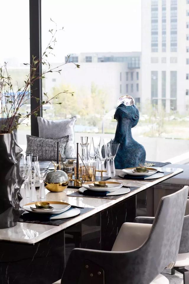 絲綢、實(shí)木、皮革、金屬、大理石,不同的材質(zhì)在對比中呈現(xiàn)不同的性格,讓空間有了層次的變化。