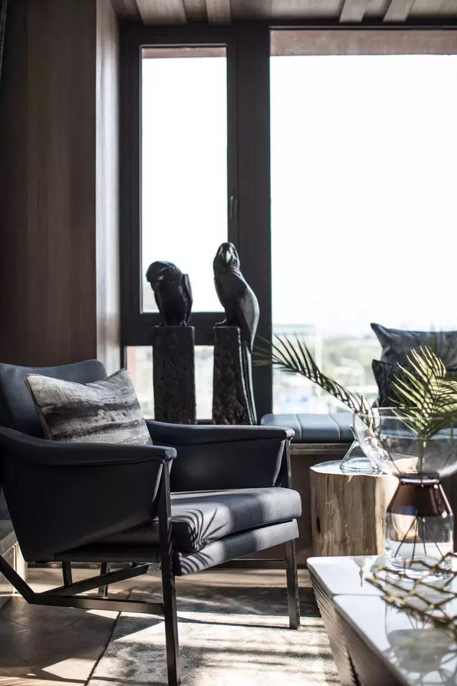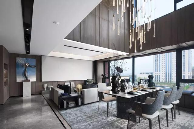 客餐廳在挑高空間的調(diào)和下融為一體,以咖色、深藍(lán)、高級灰為主色調(diào)的空間,同時以白墻與整面落地窗打造了留白的藝術(shù)。