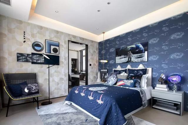 次臥以青少年為居者考慮,星辰宇宙、象限幾何構(gòu)成這個空間的表達(dá)元素。設(shè)計旨在保護(hù)年青人對于世界的探索欲和好奇心,培養(yǎng)“思考”與“實(shí)踐”的愛好。