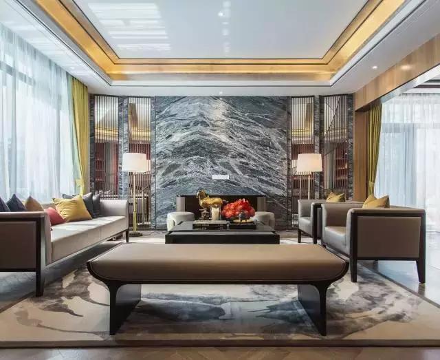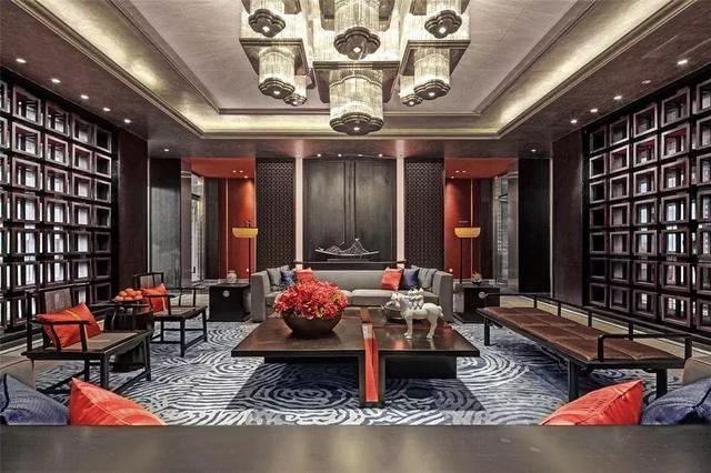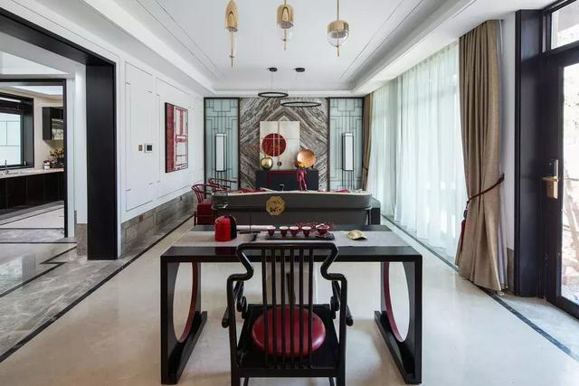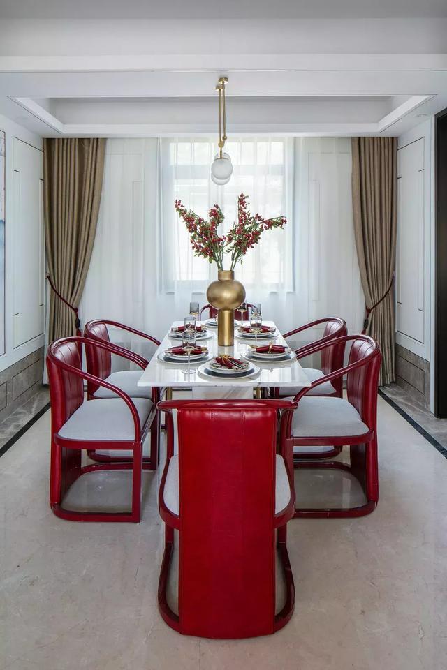 簡潔典雅的玫瑰椅,端正清秀的坐榻,氣質雍容的茶幾邊桌,質感上乘的柔軟地毯,賦予空間古雅、質樸又不失現代的美感;其古樸的造型與正統的設色,成雙陳設的器物裝飾,流麗軒昂的水晶吊燈,共同造就空間的秩序感與對稱性,儼然大氣。