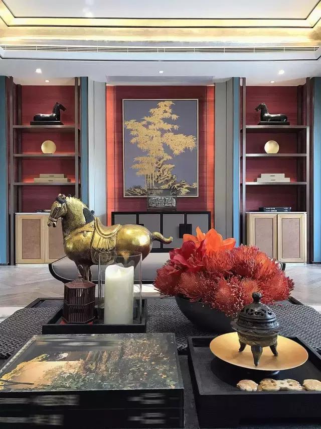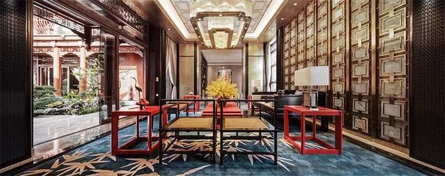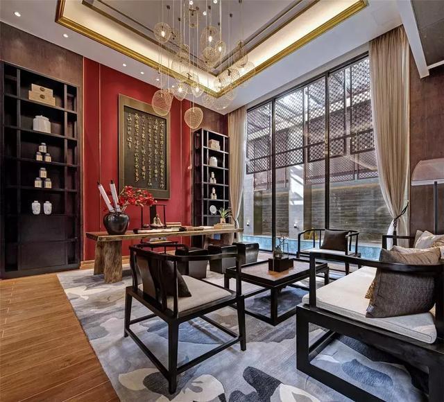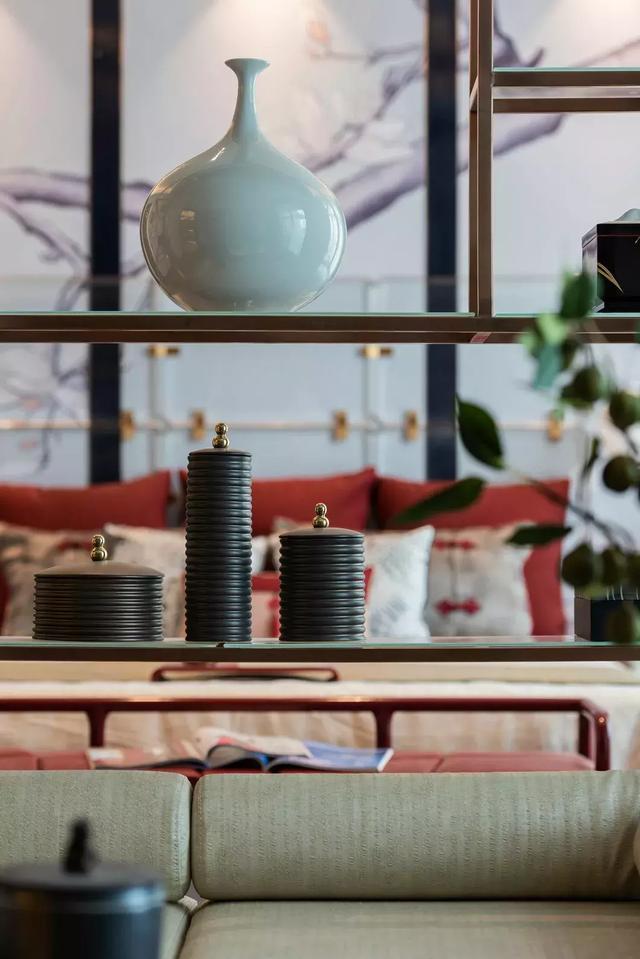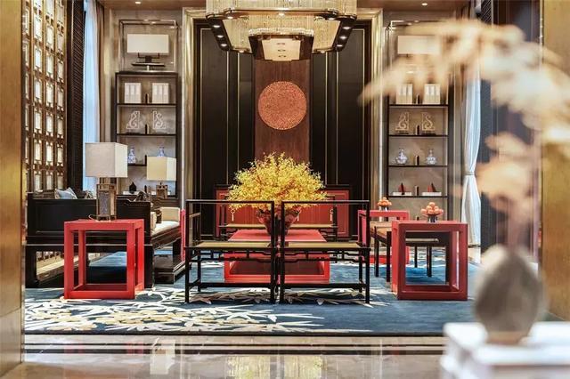 琉璃燈具上流動的光影如粼粼水紋,蕩漾在天花,又折落到柔軟的地毯上,四方周正的空間中流淌著靈趣。遵循著古代禮制的家具成序擺放,古沉的灰調與木色上搭配正統的紅色與黛藍,相得益彰,頗有大家風范。