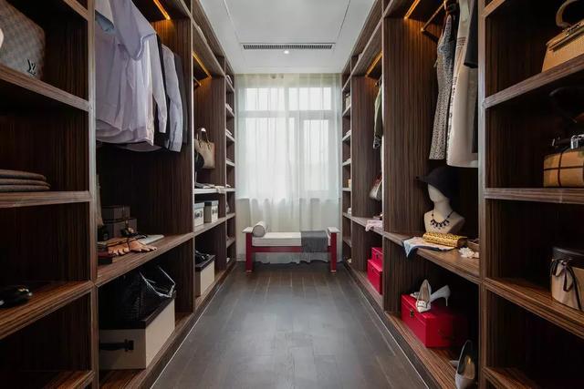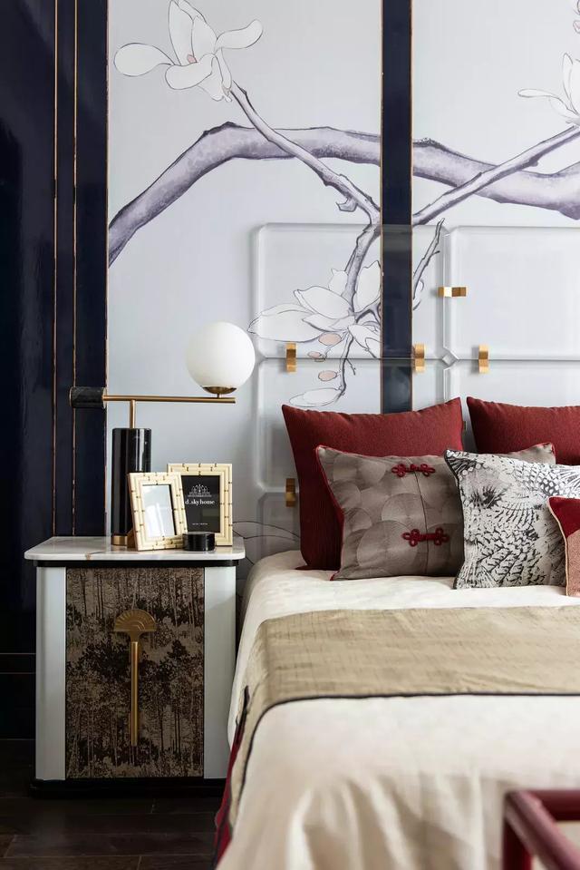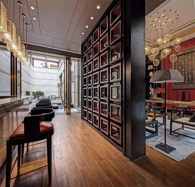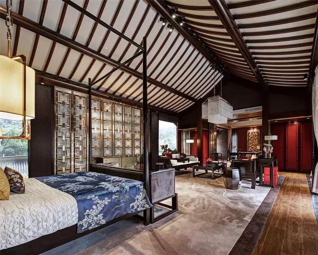 挑高的屋宇、兩側全明落地門窗的設計,引入大量自然光線與氣韻。整齊光潔的屋梁,精致大氣的柜體,舊時中式床榻椅具,針腳細膩的絲質床品,再現了舊時合院生活的典雅,使居住者于此,心中疏朗又宏大。