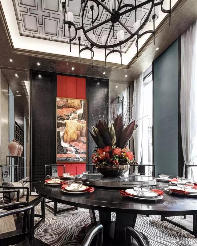 中餐廳的設計借鑒了中國傳統建筑藝術,巧妙地融入現代簡約型制。回形紋的古典框格裝點天花,圓桌餐椅排列嚴謹有序,端莊的方與大氣的圓,整體鋪設出空間高雅秀逸的意境美。