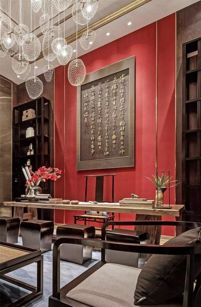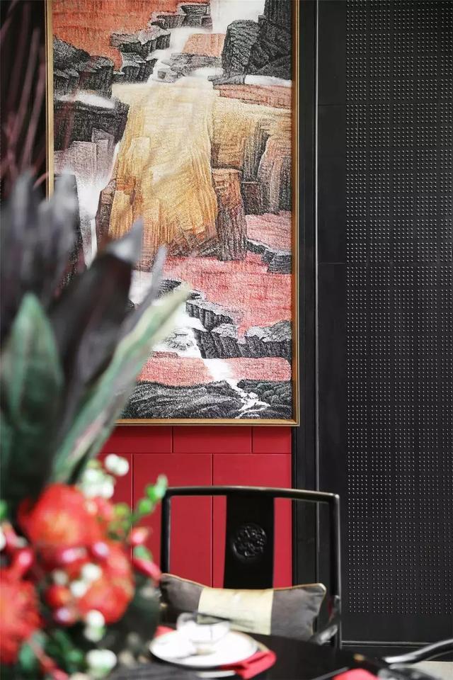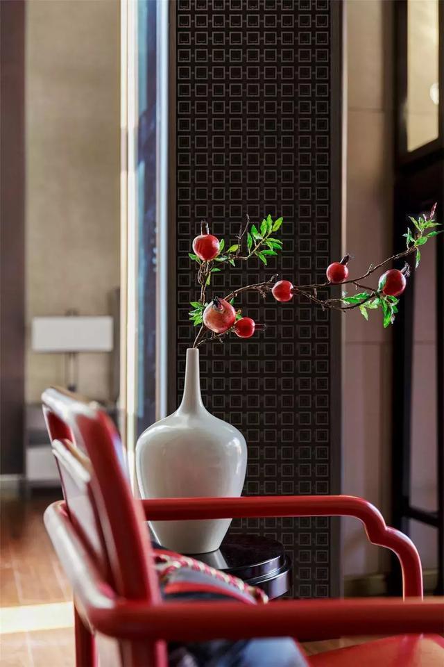 過廳,一抹明妍的鮮紅映入眼眸。絨線穿落其間的壁掛前,一張宋時簡椅,兩盞明式紙燈,朱紅與縞白互映,在細語交流中,空間更增添幾分東方古韻。