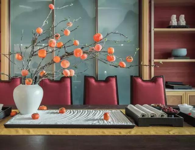 茶道的古韻古香透露著恬淡優雅的生活氛圍。脫葉已疏,幾株熟透的柿果壓枝;雕花柔美,更顯木版畫上樓閣的剛勁肅穆,折射出設計對傳統合院式空間意境的追求與傳承。