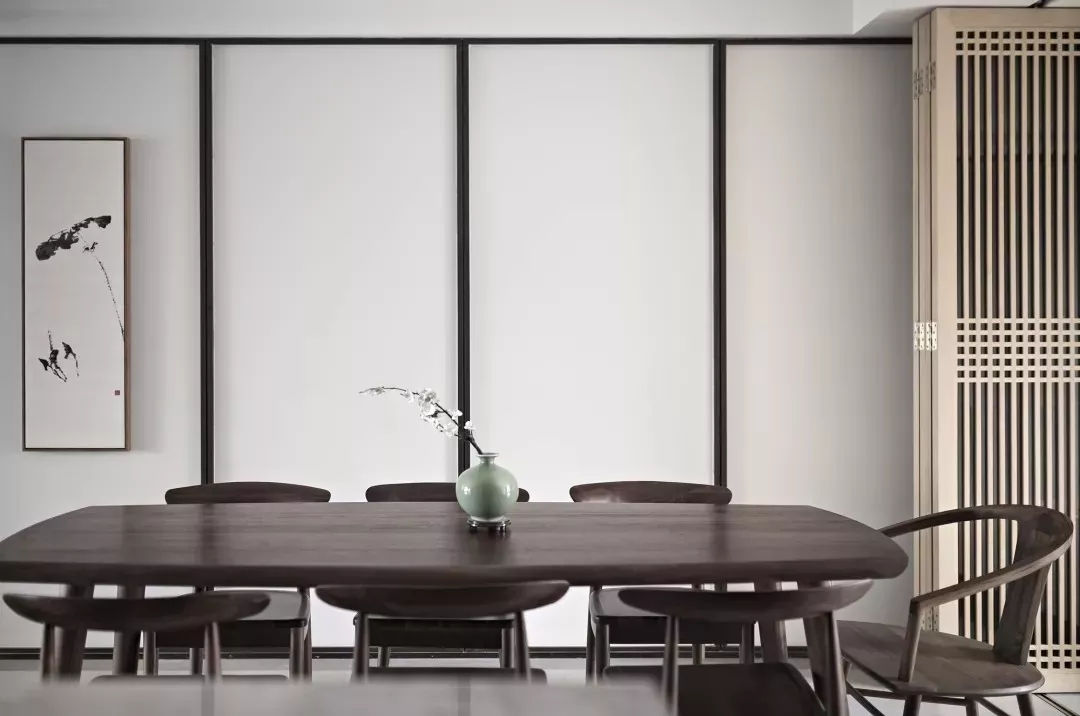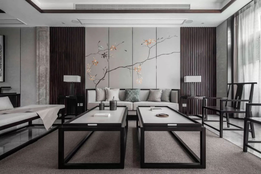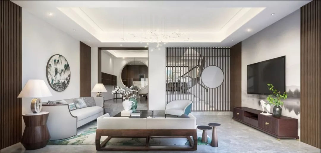 設計一套新中式風格家居,可以結合其天然質感與自然屬性來營造沉靜質樸、端方穩重的視感氛圍。而具體的搭配要點在于:一方面以木作裝飾墻面,打造高端質感。另一方面也可將棕色新中式裝飾作為空間的吸睛點用于中性色背景空間,效果一樣優雅驚艷。