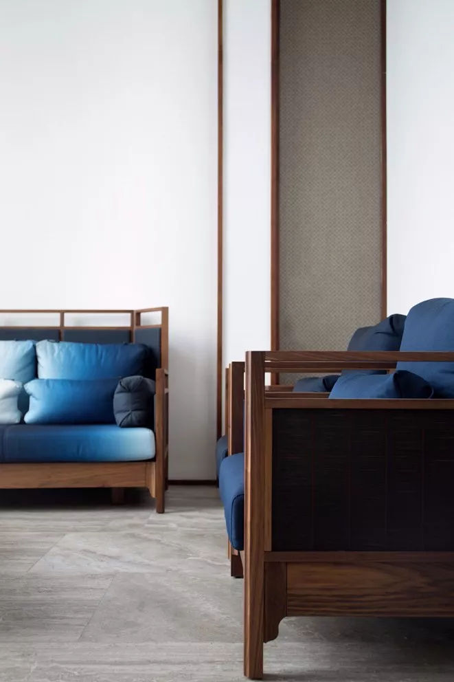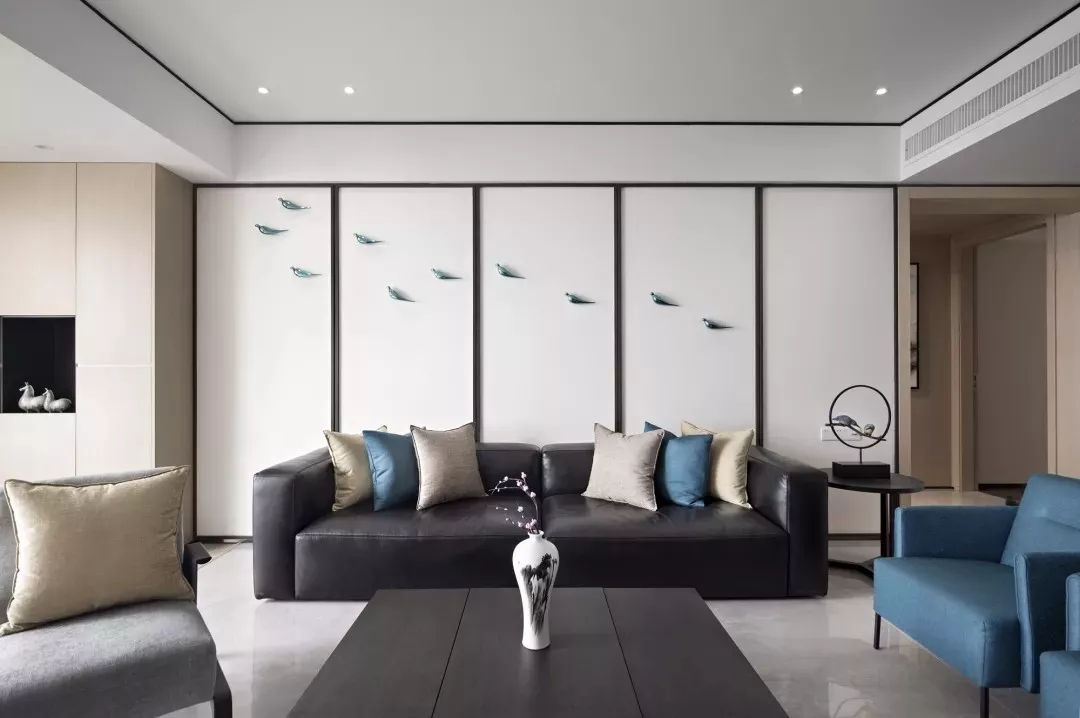 誘人的藍調展現著深遠的意蘊。將藍色與新中式結合,旨在打造典雅高貴的美韻。它的搭配要點在于:保留木紋肌理的天然質感與自然屬性和以黑白色調、簡約造型的方式呈現,可以更為巧妙地突出主題及需求。