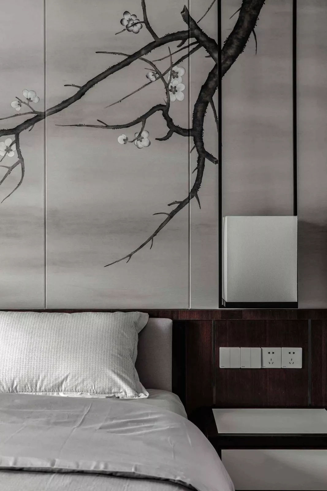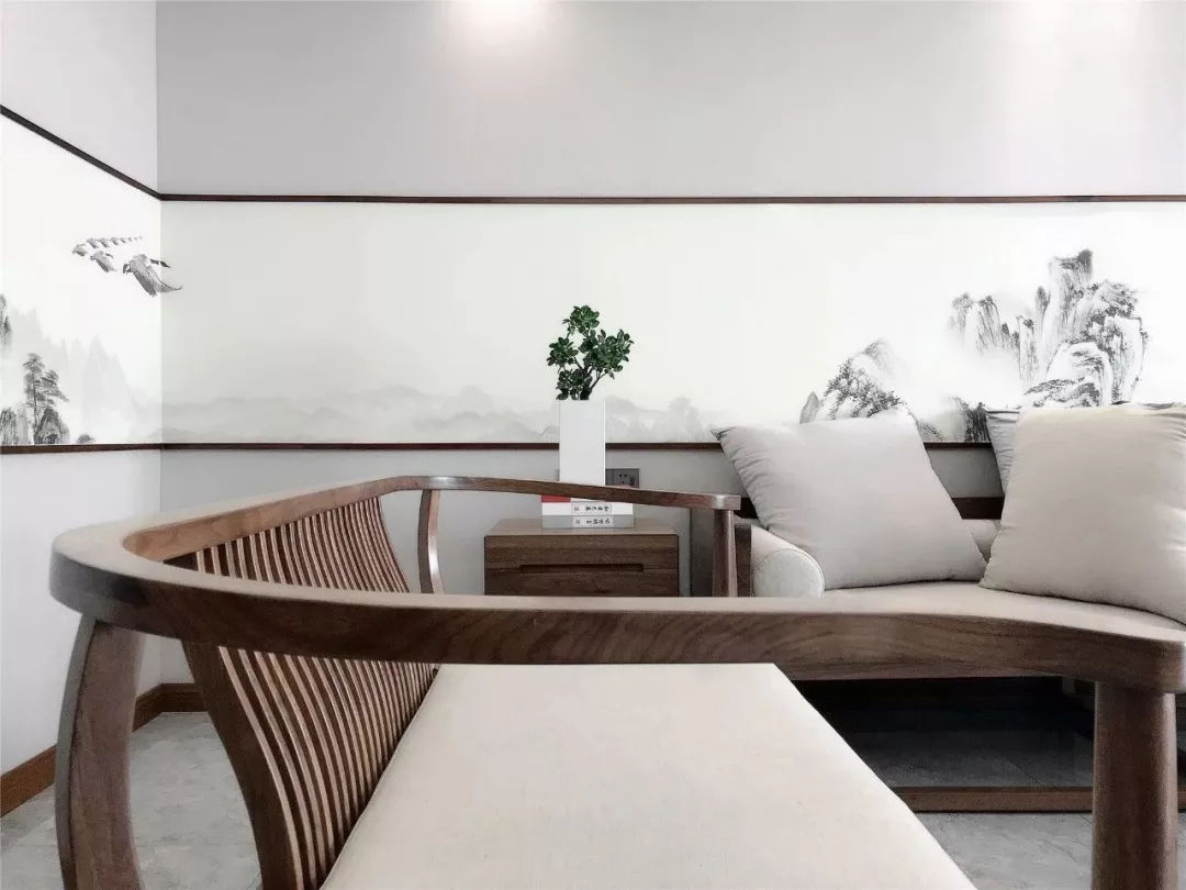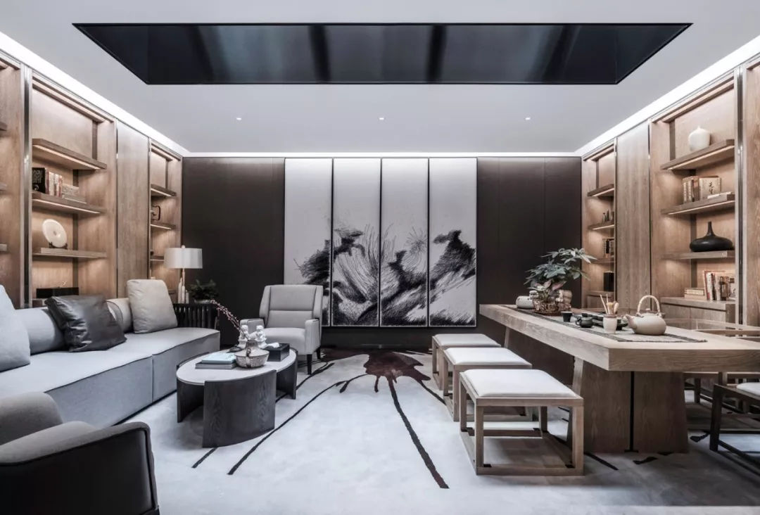 當“黑白灰”和“新中式”相遇,造就了一幅幅灰色的水墨寫意行云流水,一氣呵成。這樣躺在舒服的沙發上,光是欣賞著仿佛有生命般的水墨背景,任千年的故事順指間流淌,已經是一種享受。