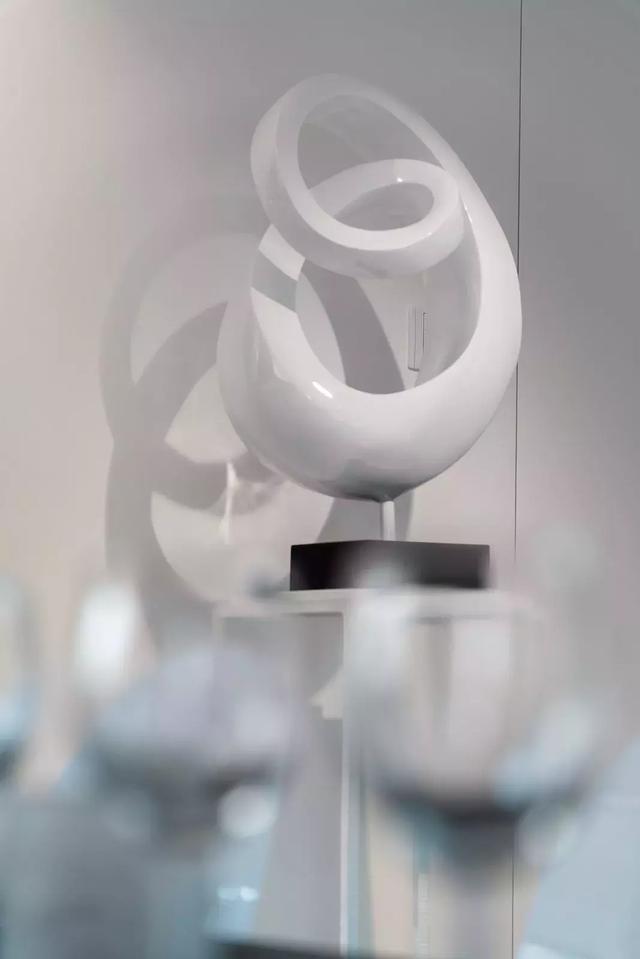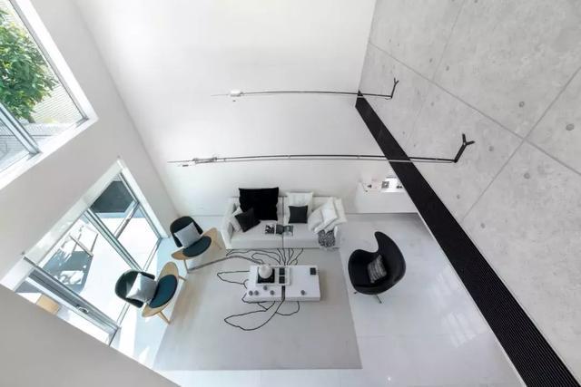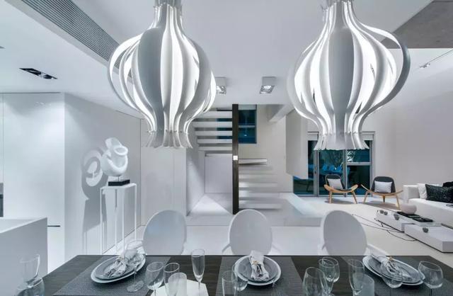 一進大門,白灰的天花板配合明亮的自然光線創造出通透開闊的空間感。首先映入眼簾的是極具線條感的魚骨型旋轉樓梯,線條干凈利落。配合四角翹起的弧形沙發宛如展現女人的曼妙身姿,兩者強烈的對比碰撞出了強烈的藝術美感,令人沉浸其中。