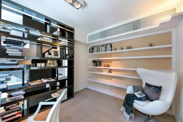 諾大的玻璃落地窗外探出的絲絲綠意,打破了極簡空間的沉悶感,讓住戶擁抱來自清晨的第一縷陽光。而書房是一隅凈化心靈的居心地,窗內白色搭配原木色,干凈雅致。窗外草色入簾青。是住戶靜心潛讀的不二之選。插入金屬黑的書柜,又不失現代感。
