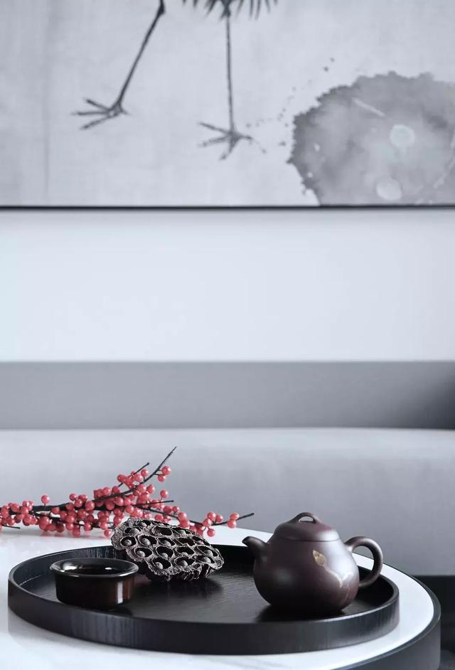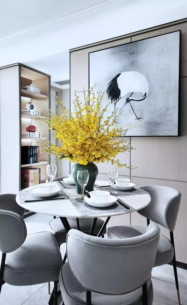 中式風格配色,除了黑白灰,還有帝王金黃色和中國紅了,餐廳這幅畫定制前為了能和餐桌上的花有呼應,加了少許黃色。