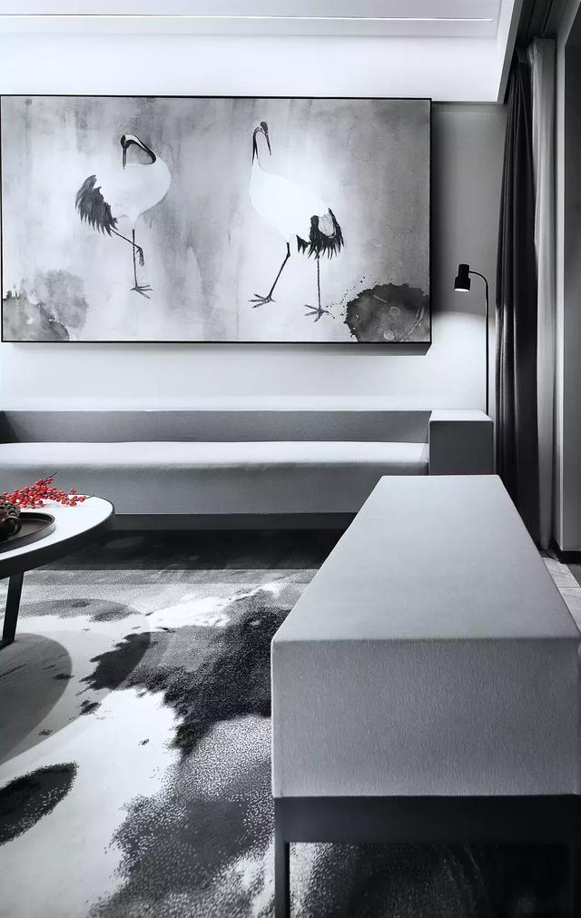 《小窗幽記》提醒“清閑之人不可惰其四肢,又須以閑人做閑事”,其中一項便是“洗硯宿墨”,地毯選用水墨紋,把中式元素引進。