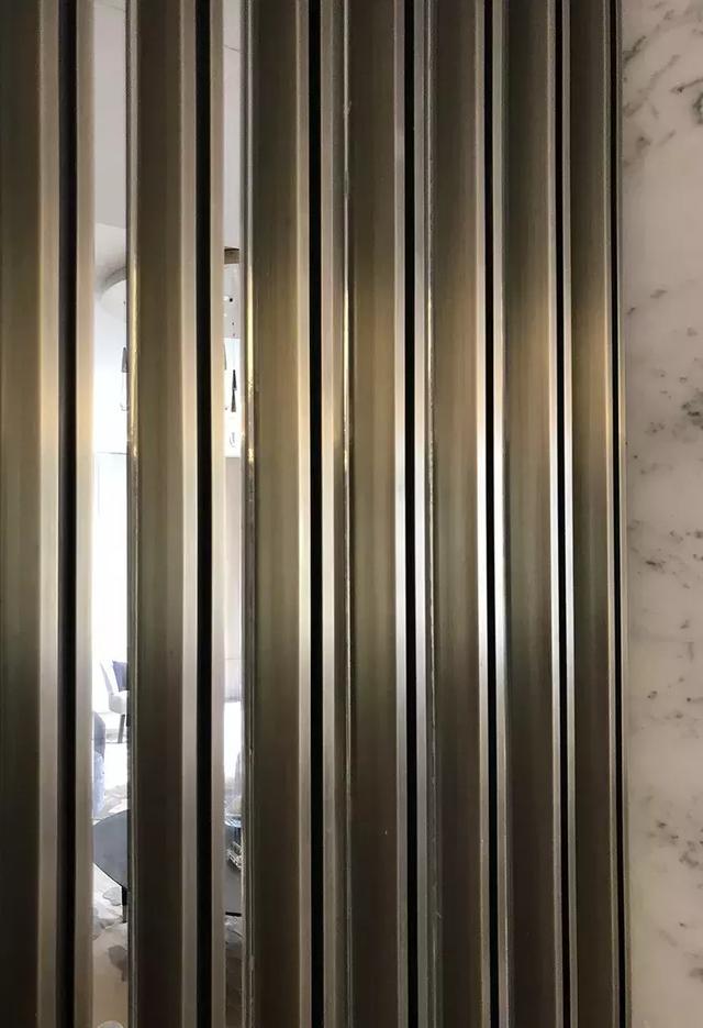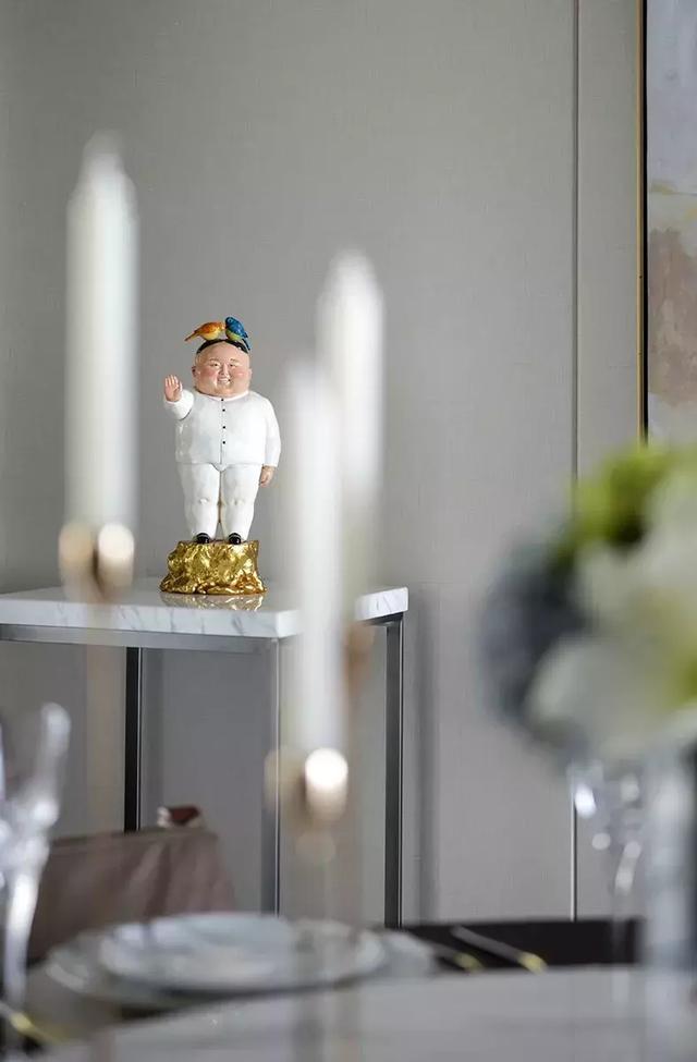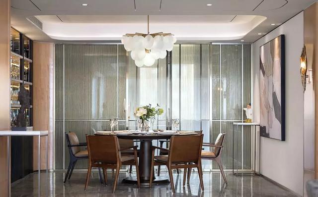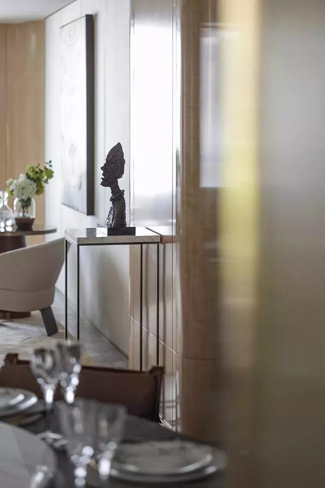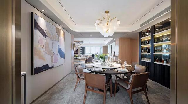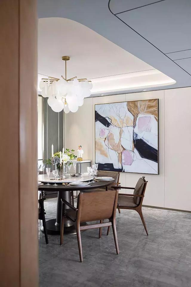 餐廳儲物柜加粗豎向線條分割大空間,細(xì)化直線構(gòu)造出三維層次感,對應(yīng)墻面的巖石抽象藝術(shù)畫,實用性與藝術(shù)觀賞性俱佳。