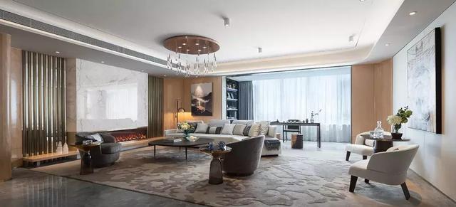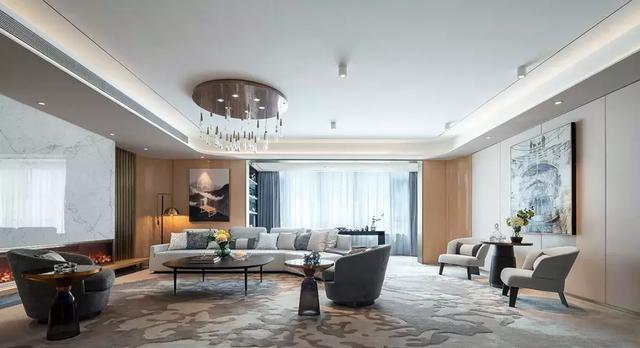 設(shè)計將陽臺改建為多功能區(qū),兼具品茶區(qū)與書畫功能,大落地窗給客廳帶來更多的觀景視野。電視背景墻用雪花白云石鋪設(shè),下嵌壁爐。地毯好似光照映射下的斑駁樹蔭,與掛畫的抽象山形互相交融,勾勒出 “山氣日夕佳,飛鳥相與還”的意境。另一側(cè)劃分出一處小休閑區(qū),恰到好處的留白盡顯空靈的東方韻味,虛實相生皆成妙景。