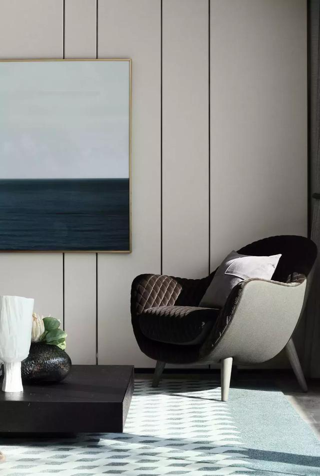 菱形格紋、直落線條、三角圓形等幾何元素排布在空間中,設計的理性力量滲透著秩序感;灰、棕、藍、黑等偏中性色調,棉麻、羊毛材質的細膩柔軟,賦予空間質樸低調而不失品位的美學質感。