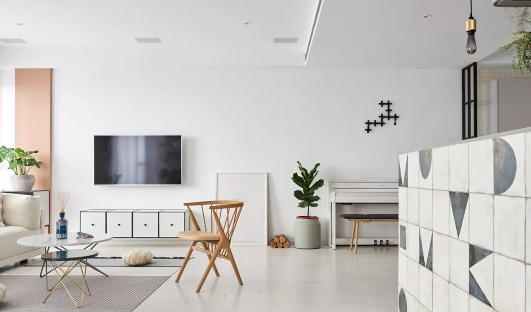 整體設計簡單、陽光。純白的墻面和木質完美結合,最后再為空間點綴濃濃風格的選品,搭配米色的布藝沙發,別致的茶幾造型,綠植的點綴,營造出一種舒適自然的生活環境。