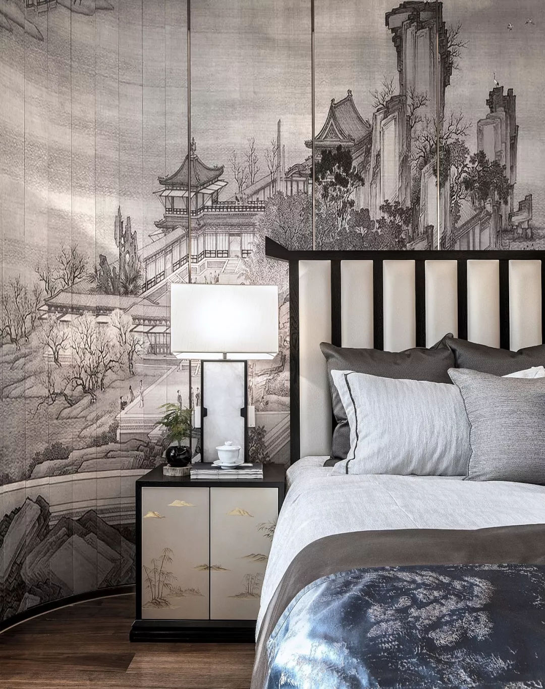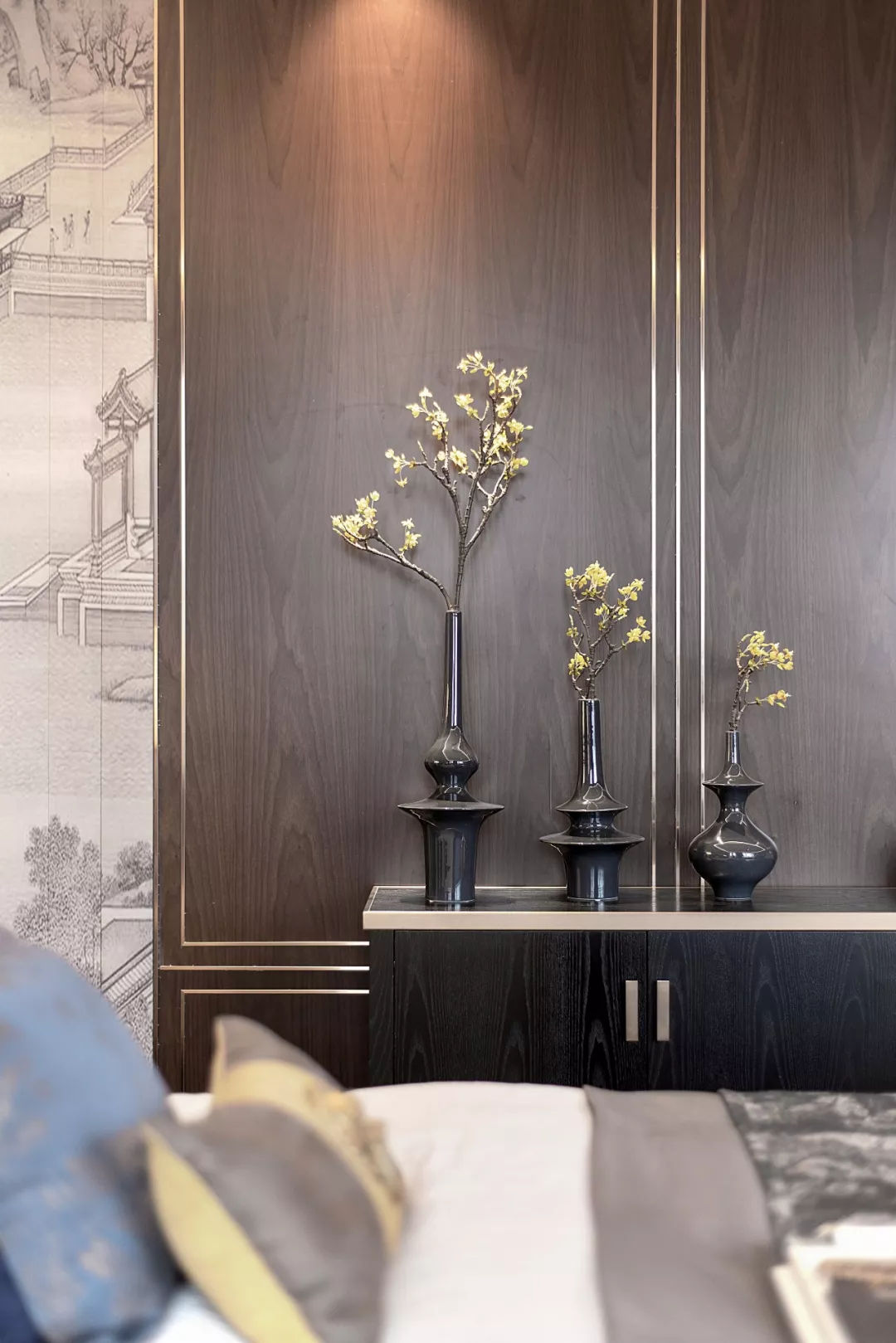 主臥位于三層,以金色襯托水墨背景,彰顯用色之考究。恰到好處的東方印象便在此顯露了,寧靜愜意,以無聲勝有聲。