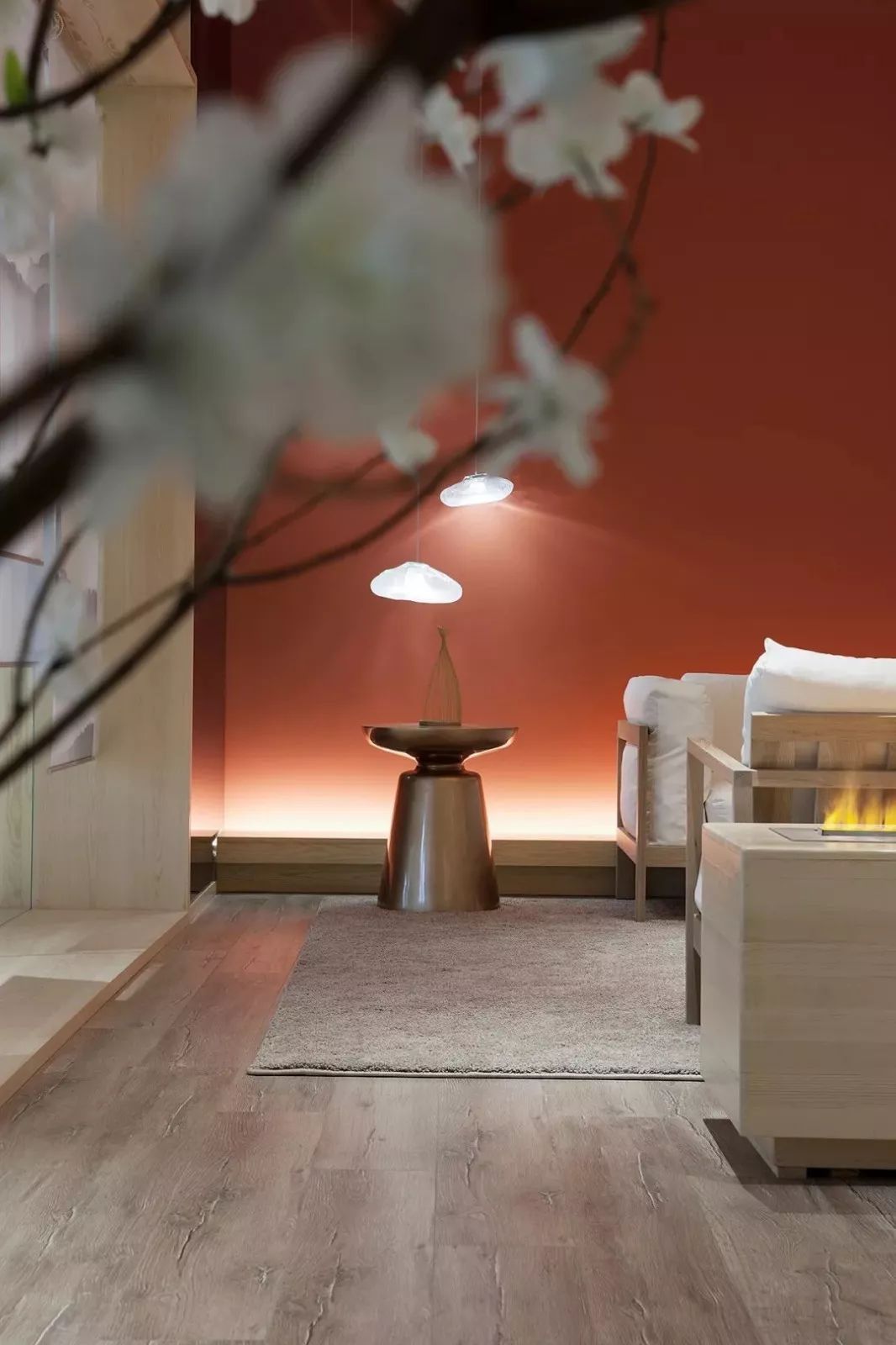 不變的紅與白主題,簡化成現(xiàn)代設(shè)計線條的紅色燈飾是空間的亮點,一旦抽離了這層空間元素,剩余孤零零的顏色變成了空洞的想象。