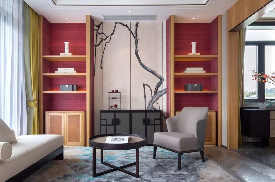 把中國紅融入現(xiàn)代時尚家居中,搭配幾何抽象圖案的裝飾元素,這便是最好的民族文化展示,熱情的紅色地毯與時尚的家具線條的碰撞,更是讓人驚喜。