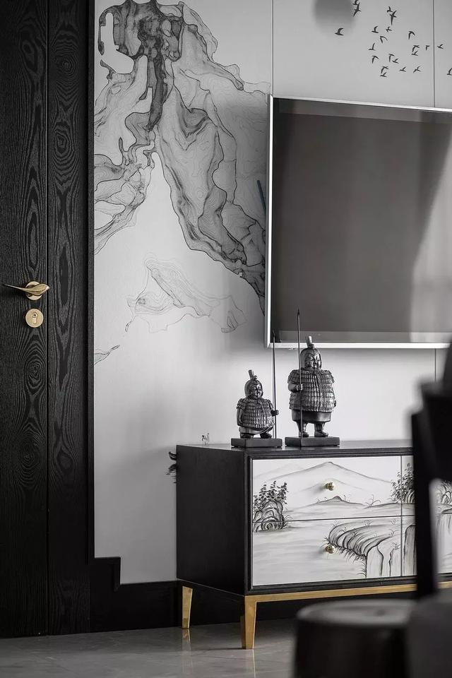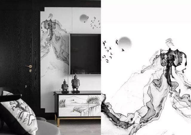 創意現代新手法的水墨畫硬包的電視背景,時尚又有中式神韻,擺脫以往傳統那種花鳥刺繡老氣的風格。