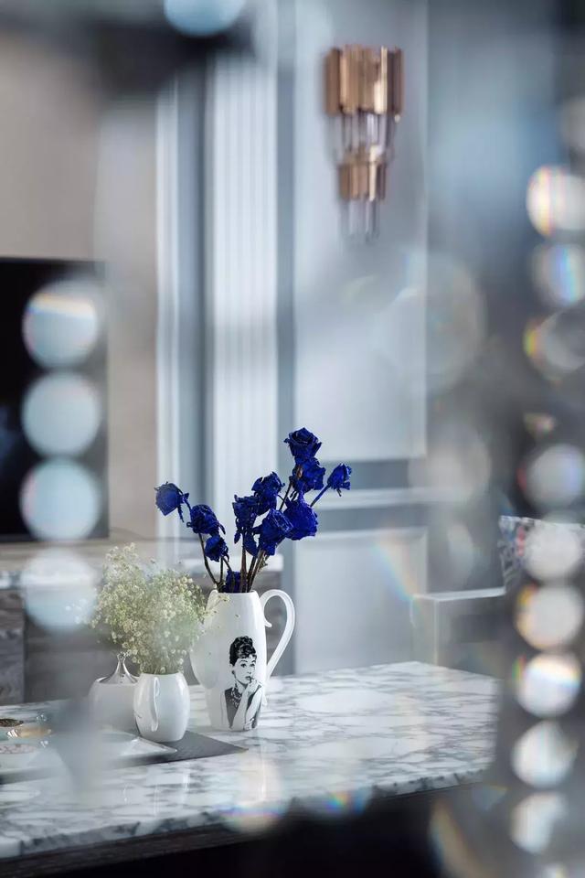 餐廳不失為整個空間的亮點,搭配極富幻想的羽毛裝飾,打造出高雅輕靈的氣質氛圍。藍與白的搭配,帶來極為舒適的視覺變化,互相融合交織共奏。輕嗅滿屋芬芳,隔著屏幕也能感受空氣中曼妙的甜香。