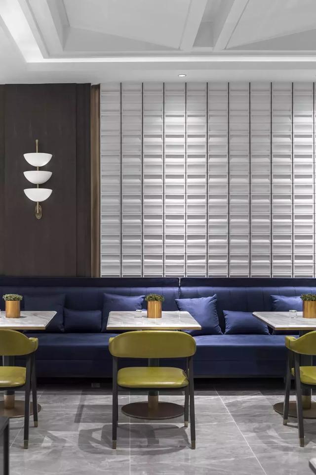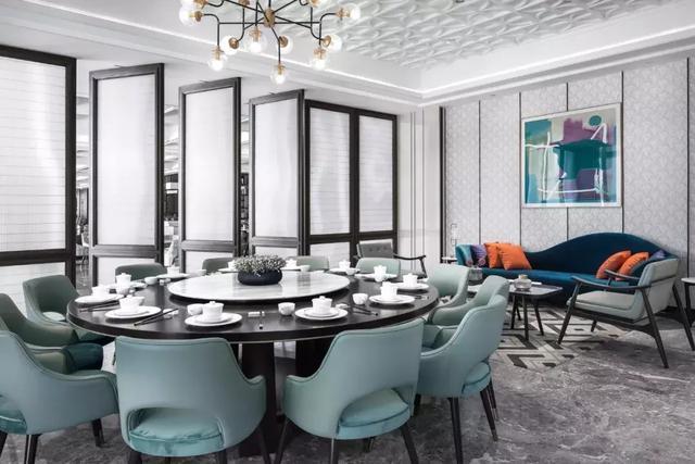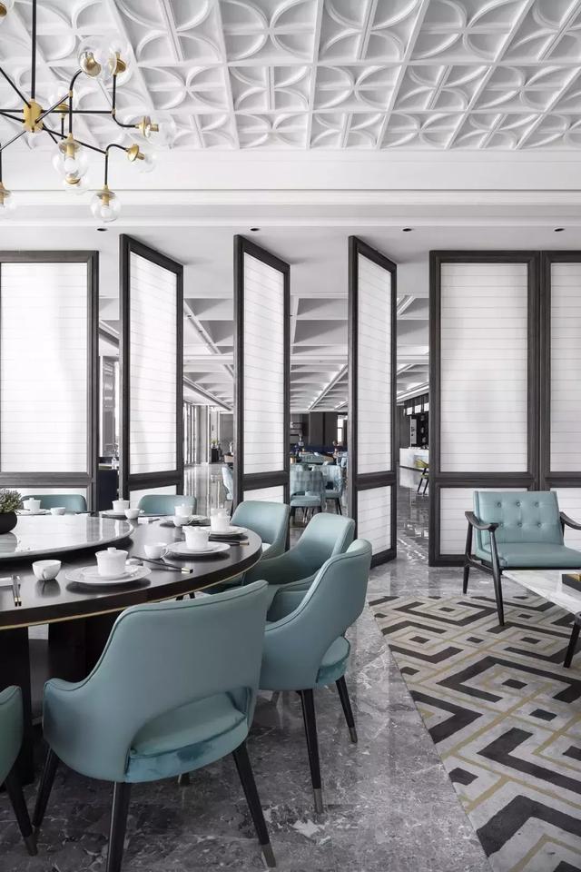 餐廳和包房中設(shè)有精心定制的屏風(fēng),塑造私密靜謐的氛圍。除此之外,湖藍(lán)色的皮革餐椅也是對海島風(fēng)情的一種重溫,與綠衣盎然的椰樹圖紋,賦予了空間獨特的海島生物美學(xué)質(zhì)感,無所謂目光所及之處的璀璨,而是滲透與細(xì)節(jié)之中的品質(zhì)與精益求精,凸顯出設(shè)計師和諧對稱的美學(xué)原則以及對不同材質(zhì)精心組合的非凡技藝,亦然突顯專享空間的愜意與安然,為傳統(tǒng)的奢華包房體驗開拓出令人眼前一亮的視角。