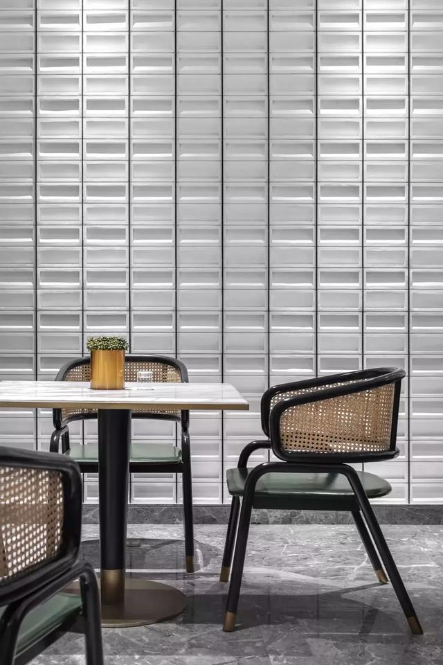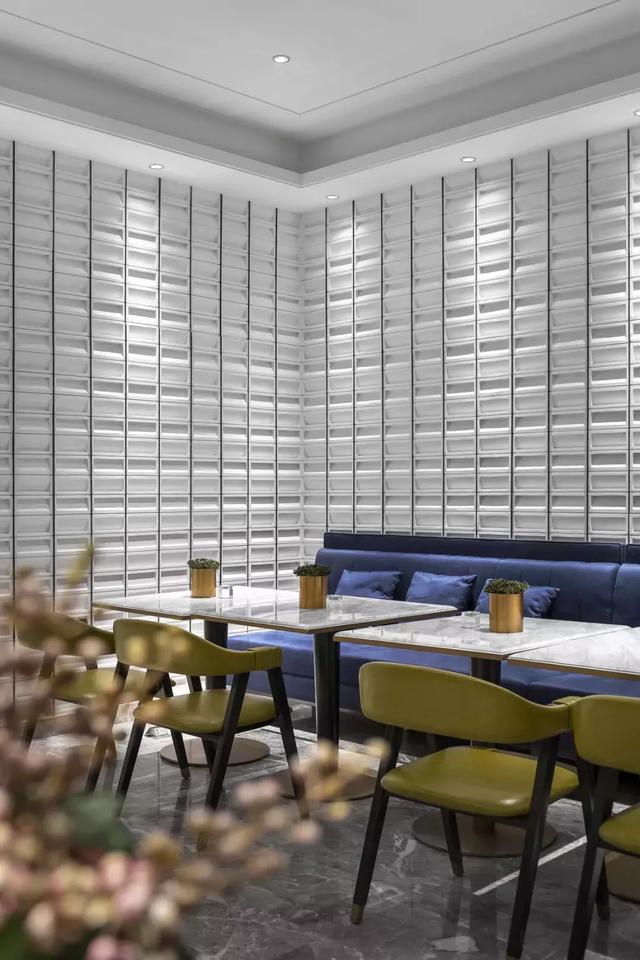 生息在海島,是廣袤原野的風(fēng)光,可相互觸摸的風(fēng)景,纖細(xì)的感覺以及愿意親近自然的情感。無論是背景墻浪型的純真還是家具型態(tài)體色的淡雅,從中都能窺探到這種純粹的意識:用人生世象去表達(dá)人間世情。 如果說墻面間的凹凸層疊是對餐廳所在地海島型態(tài)的致敬,那么飾面的花型顏色的選配,則是設(shè)計師特意而創(chuàng)造的另一種時空幻影。