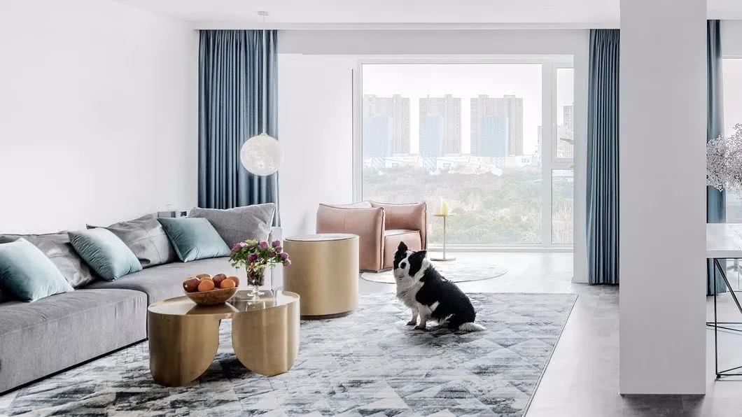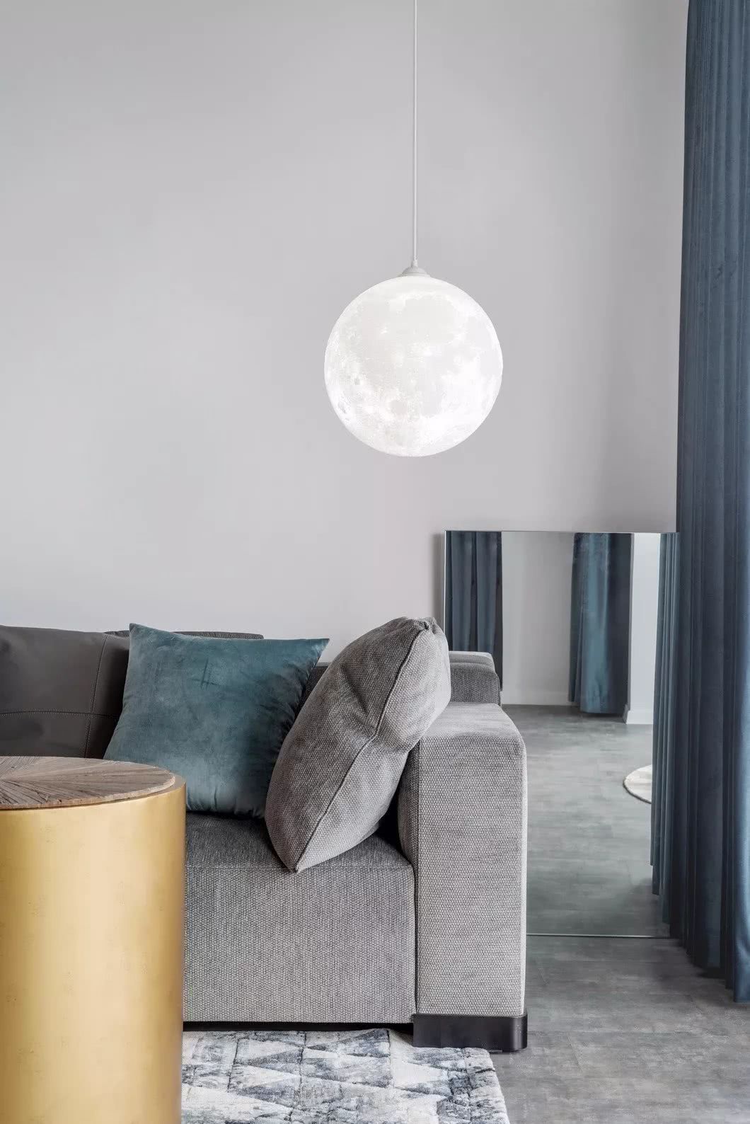 個性的吊燈與金屬的茶幾以及布藝的沙發(fā)搭配,