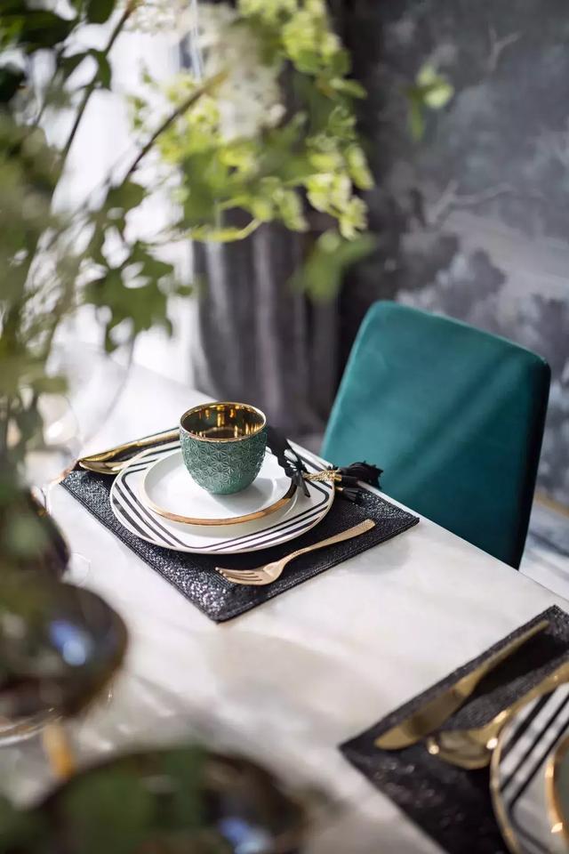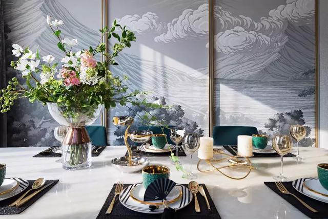 墨綠色與灰色構成強烈的對比,通過香檳金的搭配,渲染上一層奢華情調。中式風格的壁畫,做工精巧的餐具,金屬線條的勾勒,碰撞出極具韻律感的視覺沖擊,無不散發著奢華、雅致的空間氣質。