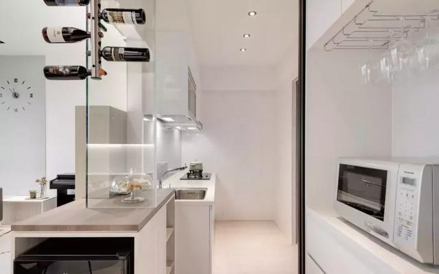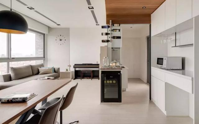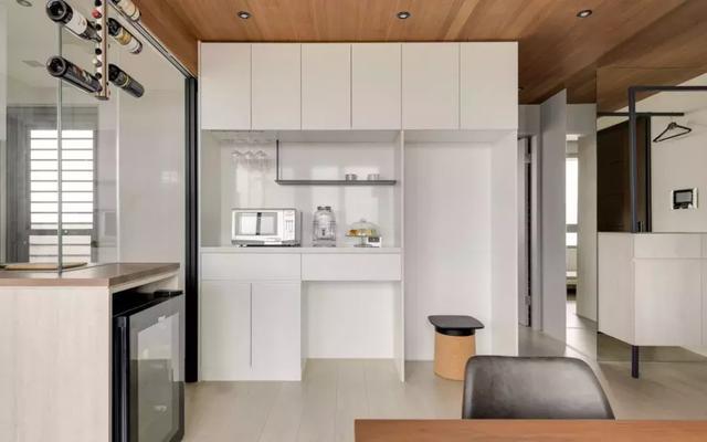 放置紅酒和電器的設計,起到了很好的隔斷效果,隔而不斷,讓客廳與廚房自然過渡。